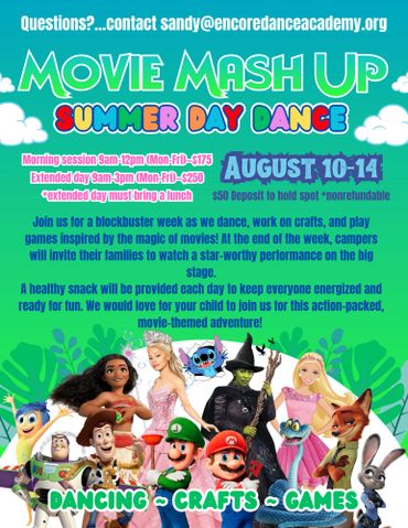 Join us for a week full of fun where your child will be learning the basics of Ballet, Jazz, Hip Hop, and some tumbling in an upbeat environment. They will learn a new dance each day which they will perform at the parent observation show at the end of the week. The dancers will also do a craft every day fitting the theme. A healthy snack will be provided but those that choose the full day will need to bring a lunch. So, get ready to have some fun and join us for an exciting week of learning!